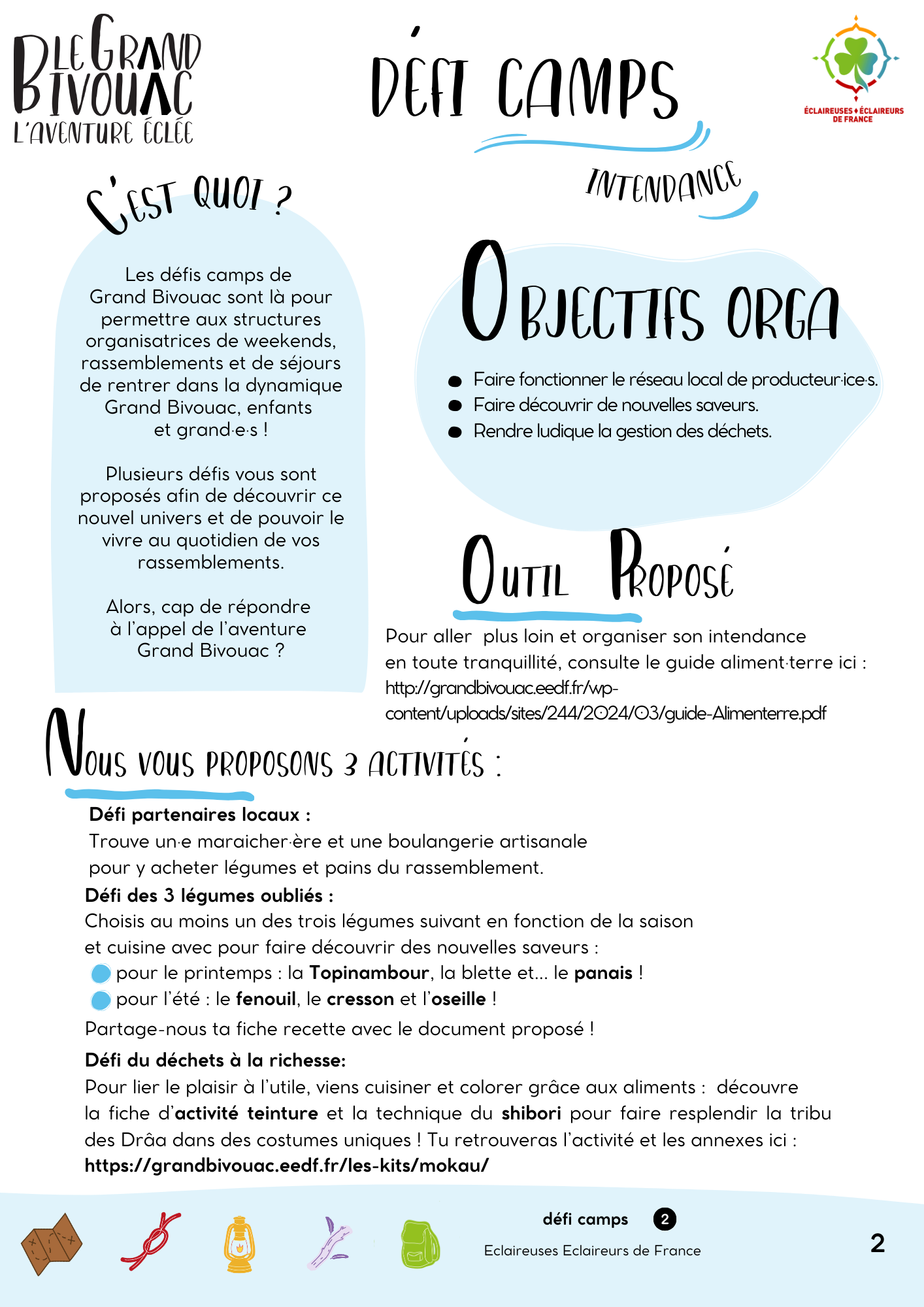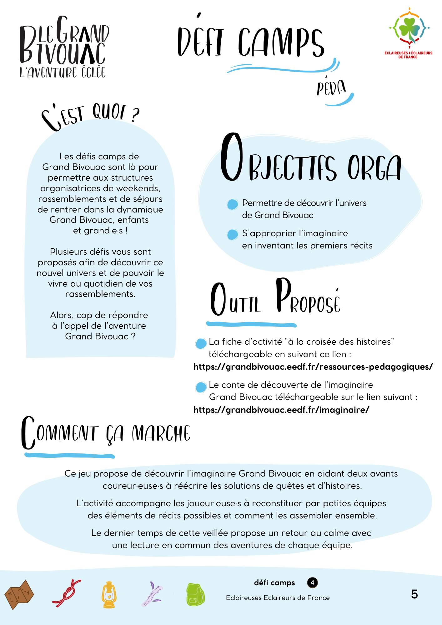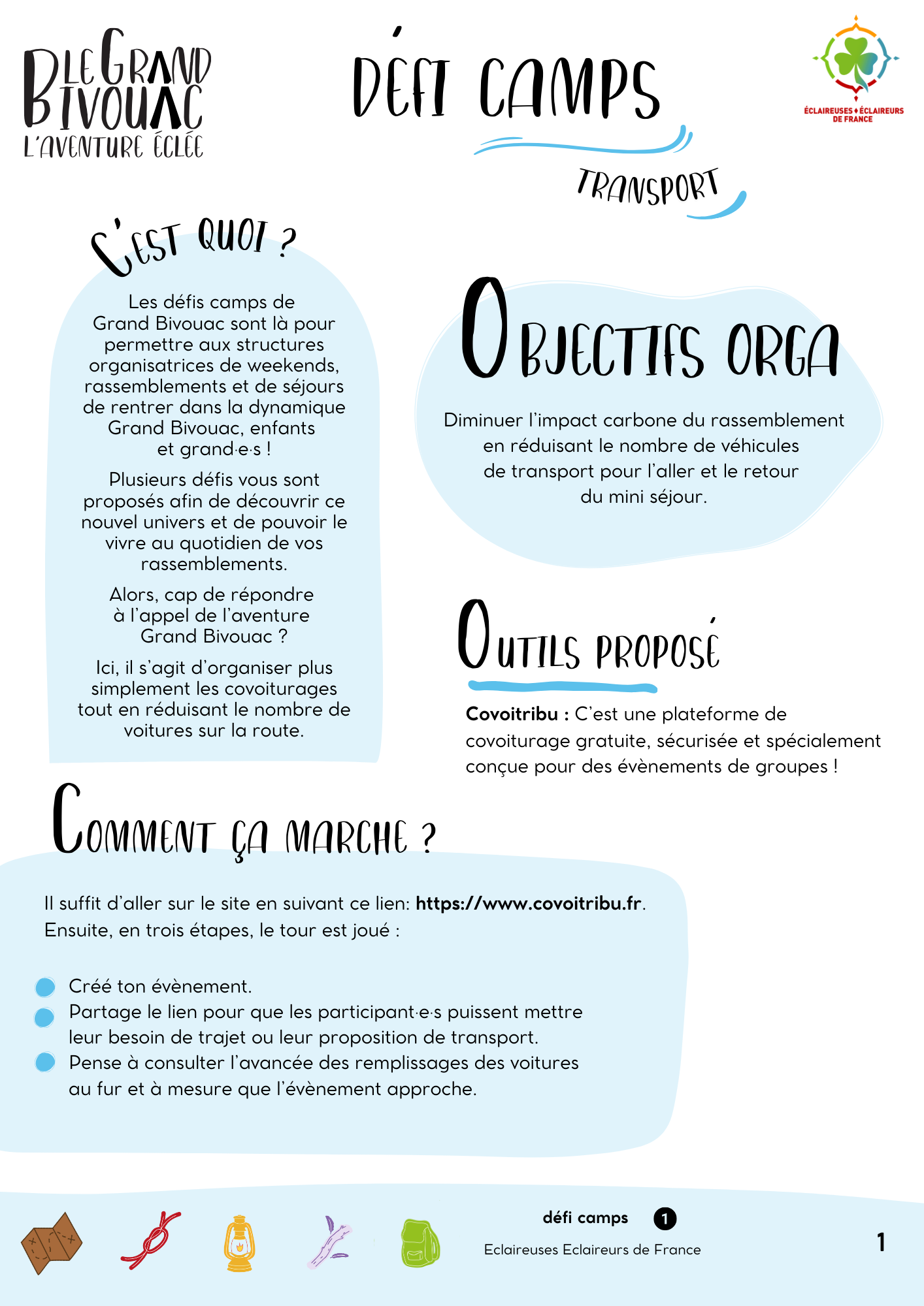 Vous pouvez trouver ici des défis accès autour du transport, de l’intendance, des déchets, de la péda ou encore de la communication qui permettront aux structures organisatrices de weekends, rassemblements et de séjours de rentrer dans la dynamique Grand Bivouac.