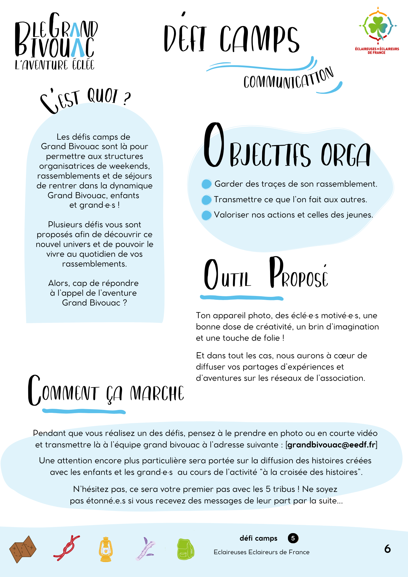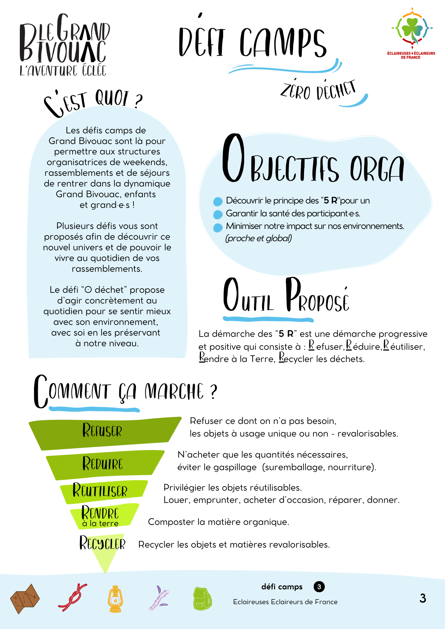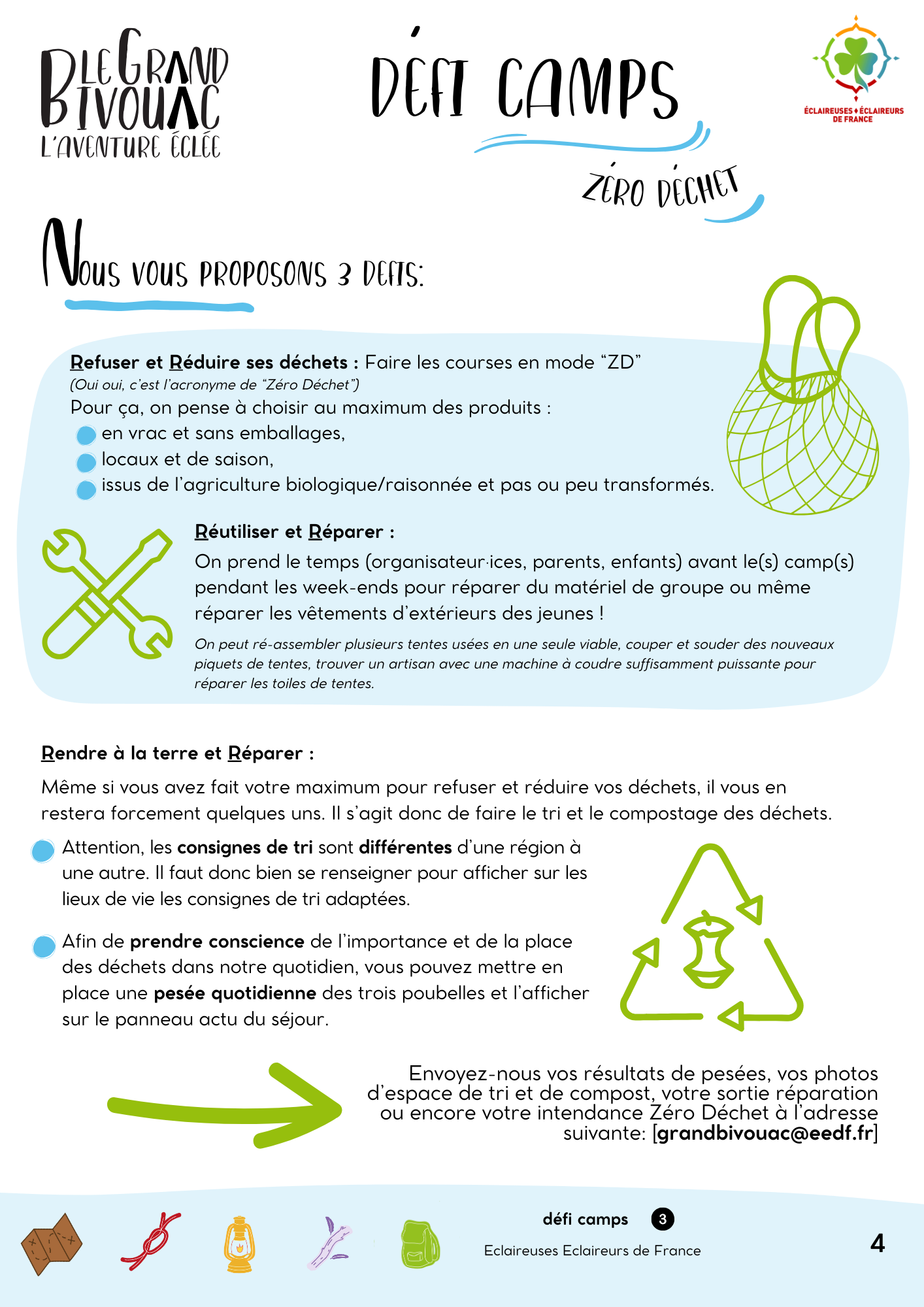 Vous pouvez trouver ici des défis accès autour du transport, de l’intendance, des déchets, de la péda ou encore de la communication qui permettront aux structures organisatrices de weekends, rassemblements et de séjours de rentrer dans la dynamique Grand Bivouac.